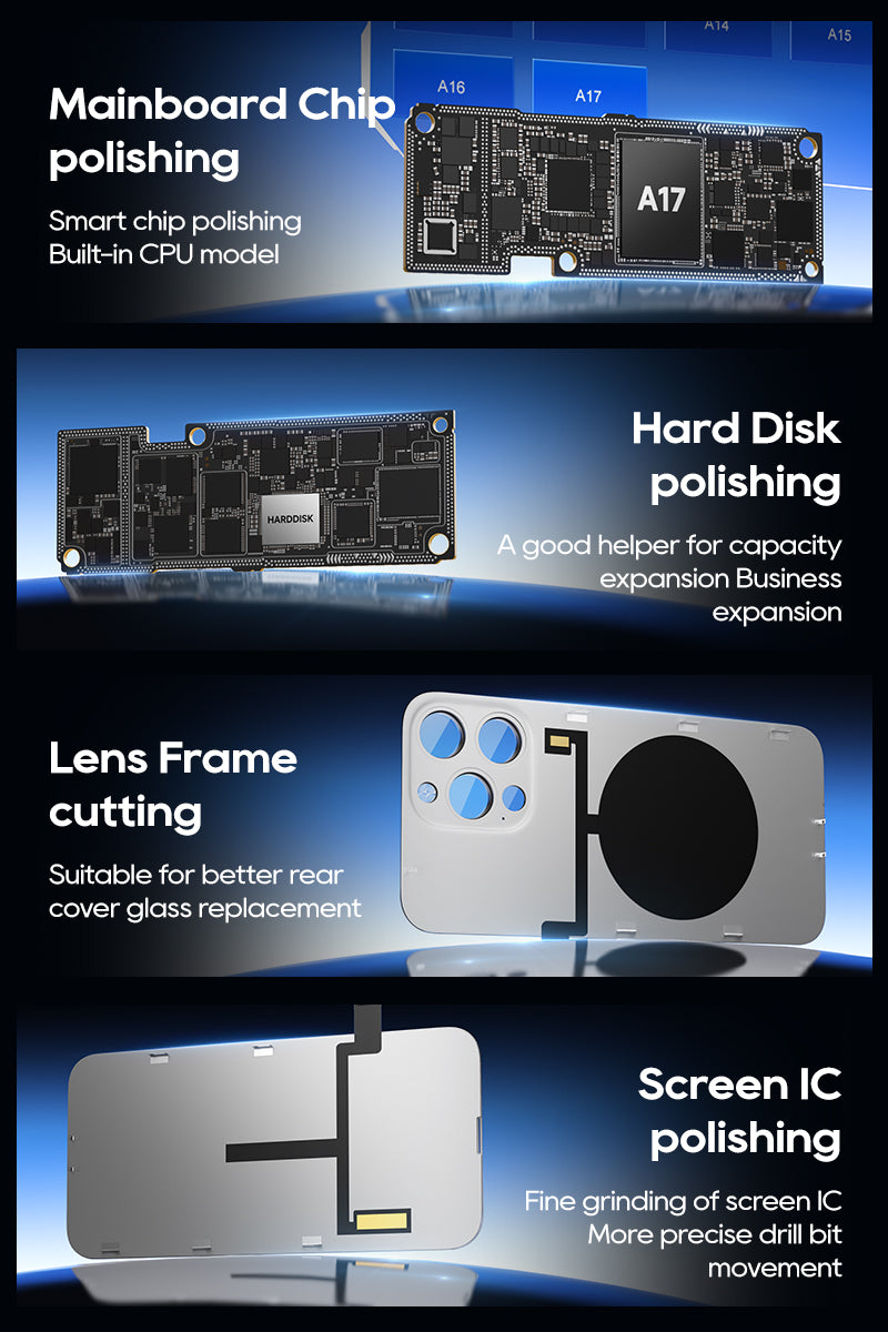 Wide Application: Mobile chip surface grinding machine for mobile phone and BGA chip, IC CPU repair, and engraving.