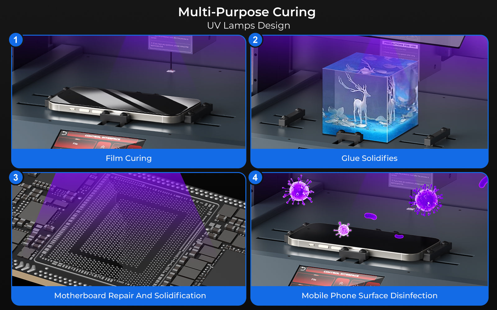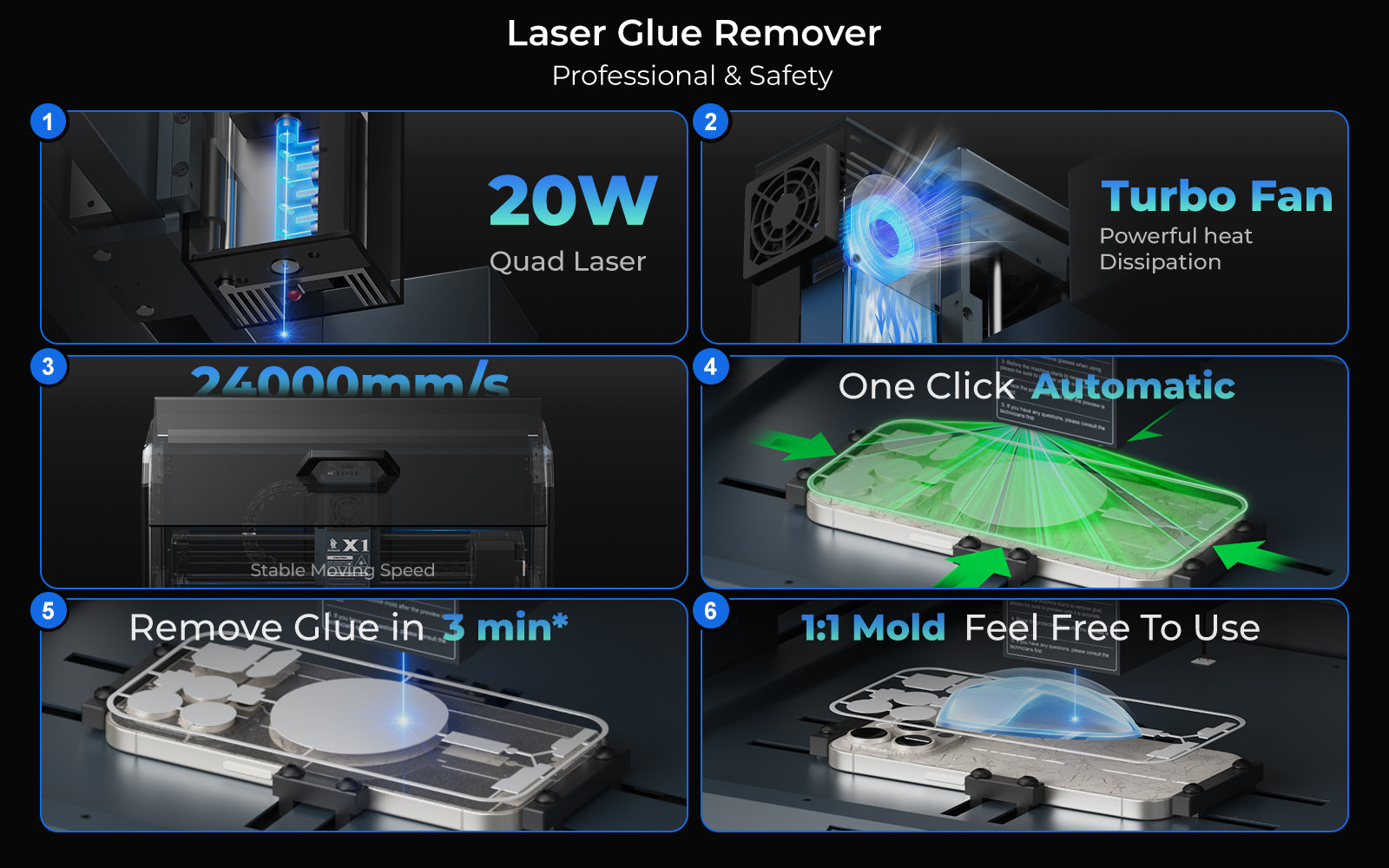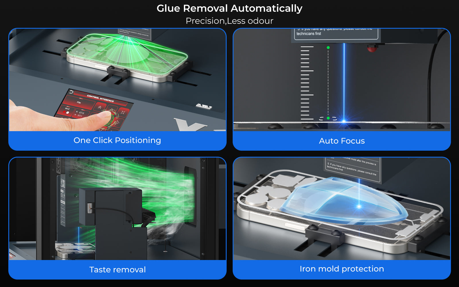 5-IN-1 Laser Glue Remover: Features glue removal on the phone back glass, engraving, glue curing, disinfection, and Dust display. The 20W laser machine makes expanding your phone repair business easy, improving economic efficiency.