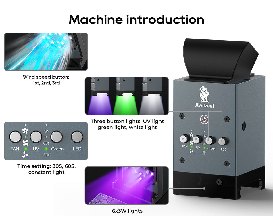 -- Function: Cooling + Curing+ Dust Display+Blow Smoke+Lighting Function
